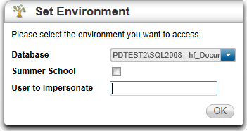 - If the Set Environment page displays, select the Database from the drop-down list.- To run TAC in the Summer School environment, check the Summer School box.
