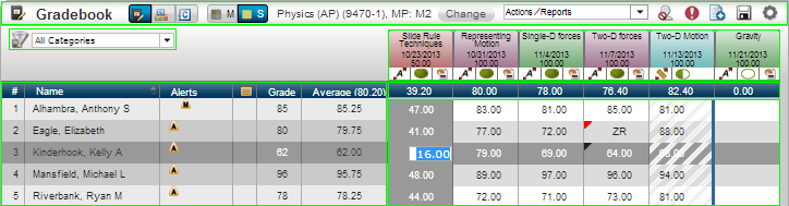 A variety of options optimize both entry speed and accuracy. For example, you can enter scores directly or select valid alpha marks from a pop-up. Invalid marks and unsaved scores are clearly identified, and comments can be attached to individual score cells. You can double-click a cell to view valid alpha marks. Alpha marks can be used to exclude an assignment from a student's average or to give the student a percentage score.
