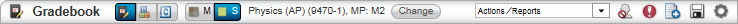 Course information is displayed adjacent to the Multiple|Single mode selector. In single-course mode, the course name and course number-section display followed by the marking period. In multiple-class mode, only the class period and marking period display to make it clear that multiple classes are being displayed. In the toolbar example above, a single course in marking period two is displayed: Physics (AP) (9470-1). | |||||||||||||||||||||