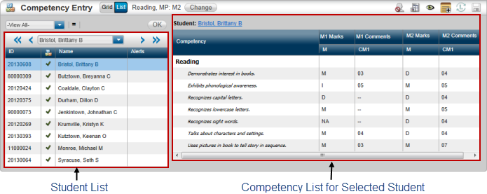 The page displays a student list on the left-hand side and the competency list for the selected student on the right-hand side. Use the student list section to select the student you are viewing. You can easily change the student you are viewing by using the navigation buttons at the top of the student list or by clicking a student's row.  here to see an illustration of the sections of this page.