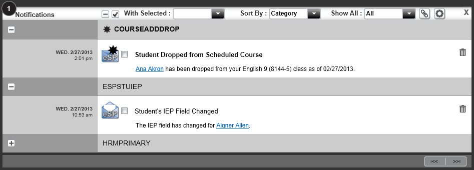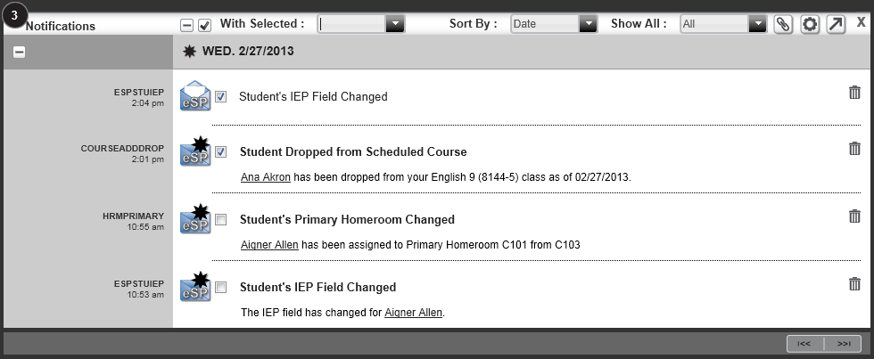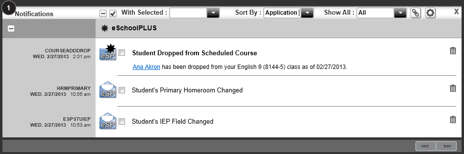 When you click  Notifications, the PLUS 360 Notifications Viewer displays notifications sent to you from eSchoolPLUS and other PLUS 360 applications you use, when applicable.