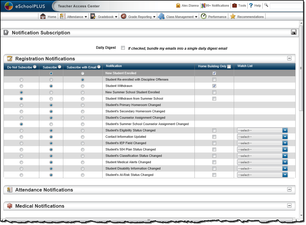 Note: If no option button displays in this column, this notification has been designated as mandatory at either the district or building level. You cannot turn off a mandatory notification. By default, the Subscribe option is selected for mandatory notifications; however, you may instead select the Subscribe with Email option to also receive an email for this notification type.