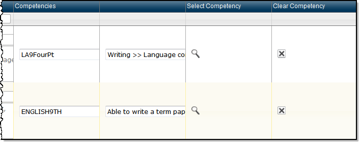 icon in the far right of the criterion's row to launch the Competency Selection pop-up dialog box. Select a competency by clicking in the row of the desired Competency and then click OK to enter it in the criterion's row. If your district has a large number of competencies, you can use the Competency Selection pop-up's sort and search features: