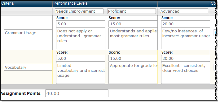 Sum - To sum the scores of each criterion to calculate the student's assignment score. This selection lets you weight each criterion differently. When Sum is selected, you enter a distinct maximum point value for each criterion in the highest Performance Levels Score field (the rightmost column). The sum of these values is the maximum points possible for the assignment and is displayed in the Assignment Points field at the bottom of the grid. You then populate the grid with each criterion's Performance Levels Score value being less than the score to its right.