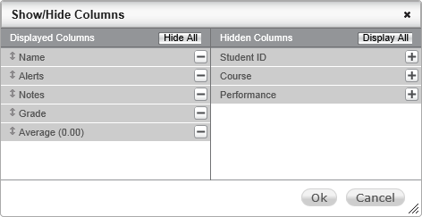 You can add, remove, and reorder student information columns. On grids with selectable columns, right-click the header row, and then select Show/Hide to launch the Configure Columns dialog box shown to the right.
